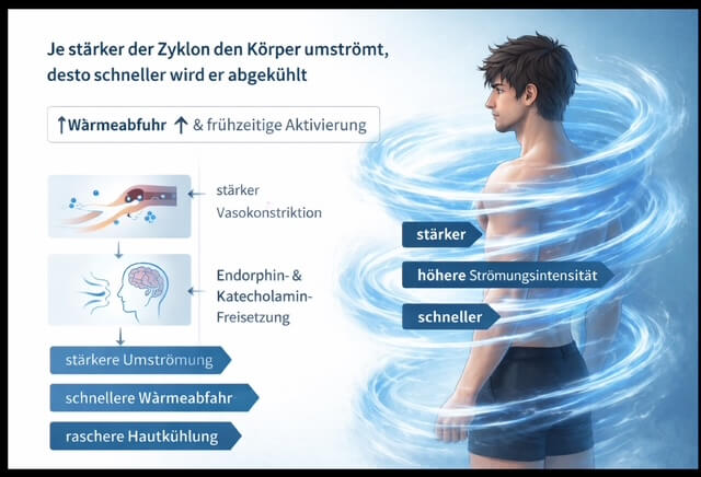Der Cyclone wirkt somit nicht nur als Transportmedium für kalte Luft, sondern als entscheidender Verstärker der Kühlrate. Eine intensivere Umströmung führt zu einer schnelleren, gleichmäßigeren Kälteexposition und damit zu einer frühzeitigen neuroendokrinen Reaktion . Je stärker und homogener der Kaltluft-Cyclone den Körper umströmt, desto schneller wird Wärme abgeführt – und desto schneller reagiert der Organismus neurophysiologisch.
